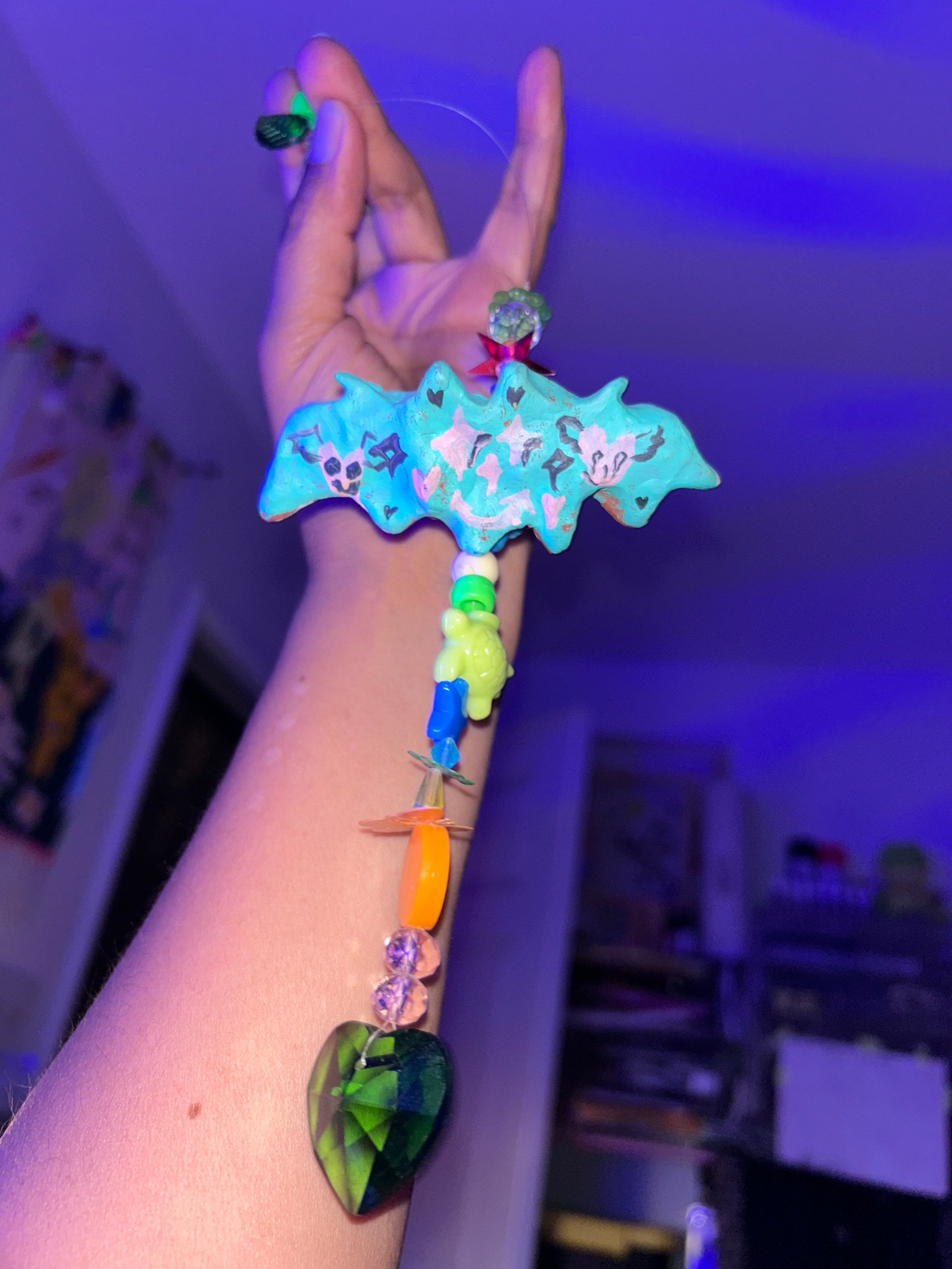 A shimmering nocturnal sentinel sculpted from clay, adorned with glass heart suncatcher/ rainbow prism maker, vintage sequins, pony and crystal beads. Painted in celestial tones to match the Dreamwizard, this winged being offers protection, clarity, and gentle transformation.